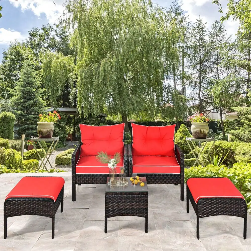 5PCS Patio Set Sectional Rattan Wicker Furniture Set w/ Red Cushion